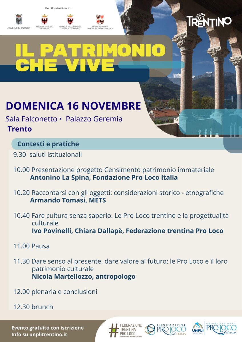 “Il patrimonio che vive” è un evento organizzato da Fondazione Pro Loco Italia e Federazione Trentina Pro Loco, per approfondire la conoscenza del patrimonio culturale immateriale “vivente”, cioè quello sperimentato in prima persona nelle comunità.
